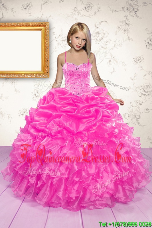 Perfect Organza Spaghetti Straps Sleeveless Lace Up Beading and Ruffles and Pick Ups Pageant Dress for Teens in Hot Pink