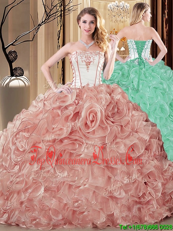 Perfect Organza Strapless Sleeveless Lace Up Embroidery and Ruffles Sweet 16 Dress in Champagne