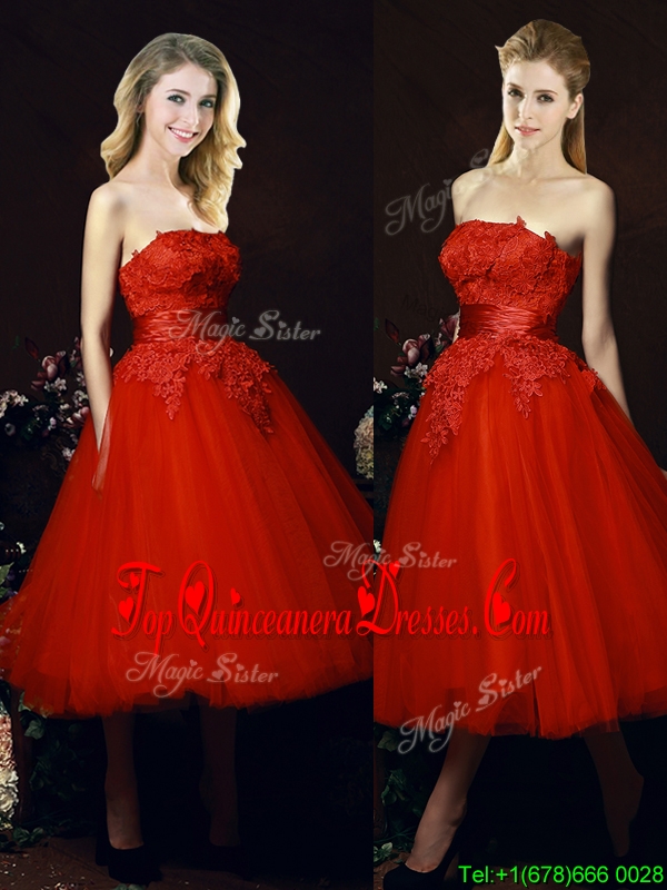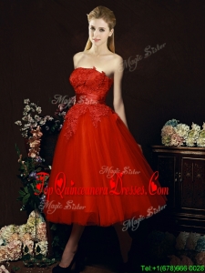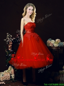 Perfect Puffy Skirt Strapless Applique Tea Length Red Damas Dress