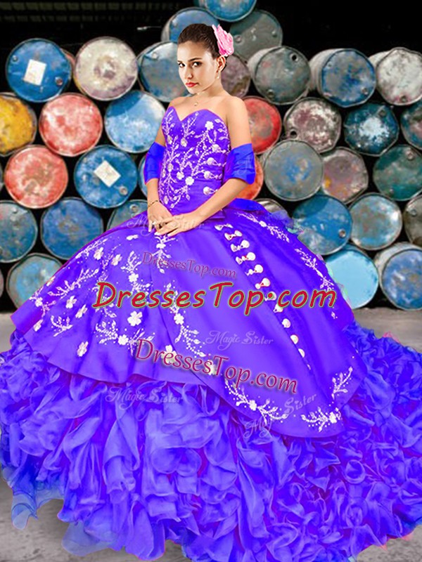 Perfect Purple Ball Gowns Organza Sweetheart Sleeveless Embroidery and Ruffles Lace Up 15 Quinceanera Dress Brush Train