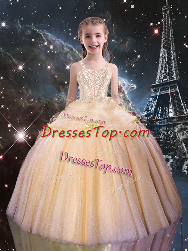 Perfect Sleeveless Tulle Floor Length Lace Up Kids Formal Wear in Peach with Beading
