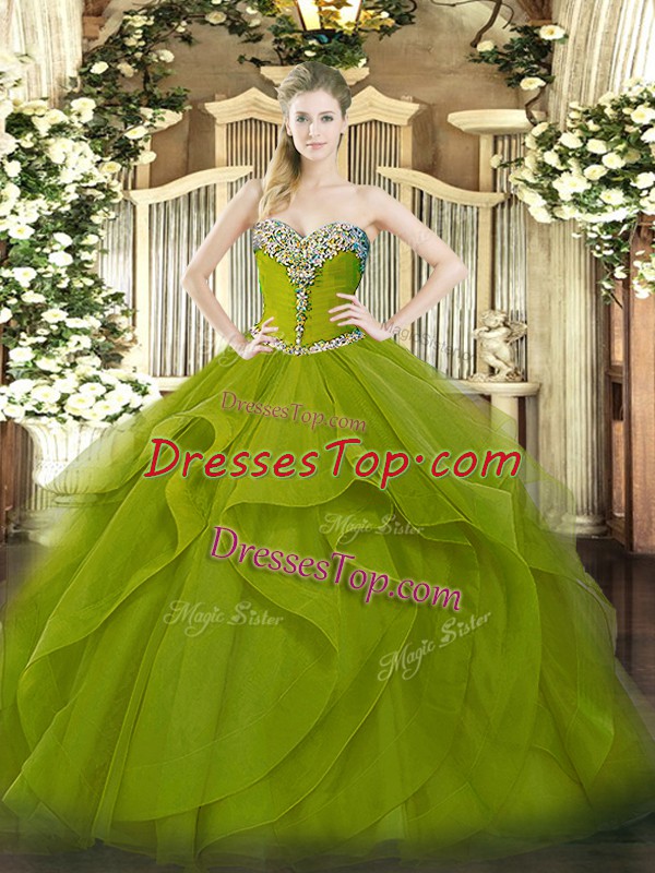 Perfect Tulle Sweetheart Sleeveless Lace Up Beading and Ruffles Sweet 16 Dress in Olive Green