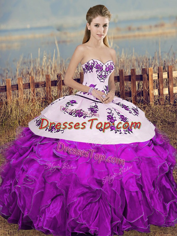 Perfect White And Purple Sweetheart Lace Up Embroidery and Ruffles and Bowknot Vestidos de Quinceanera Sleeveless
