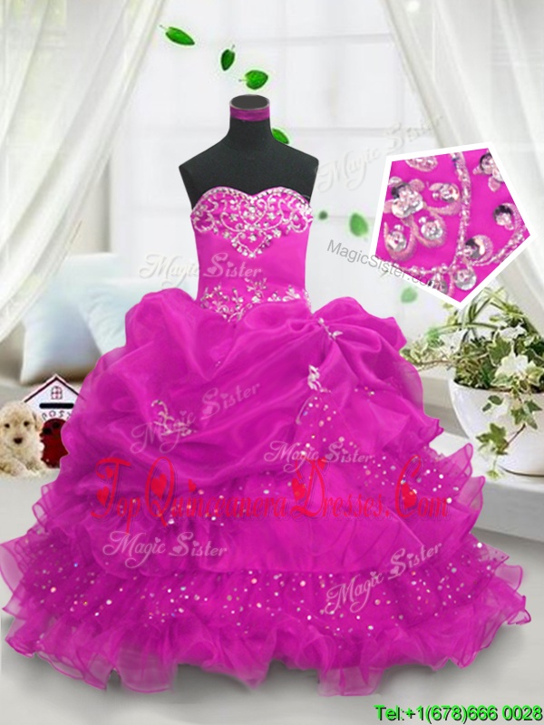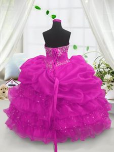 Pick Ups Ruffled Ball Gowns Pageant Dress for Girls Hot Pink Sweetheart Organza Sleeveless Floor Length Lace Up
