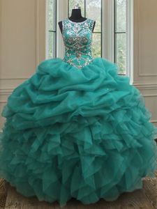 Pick Ups See Through Scoop Sleeveless Lace Up 15 Quinceanera Dress Turquoise Organza