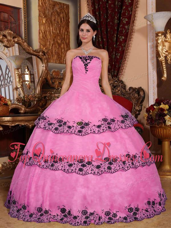 Pink Ball Gown Strapless Floor-length Organza Lace Appliques Unique Quinceanera Dress