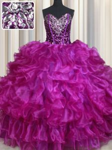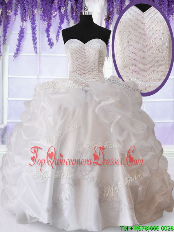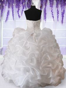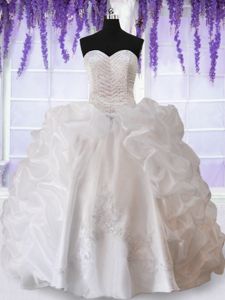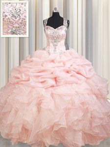 Pink Ball Gowns Organza Straps Sleeveless Beading and Ruffles and Pick Ups Zipper Quince Ball Gowns Brush Train