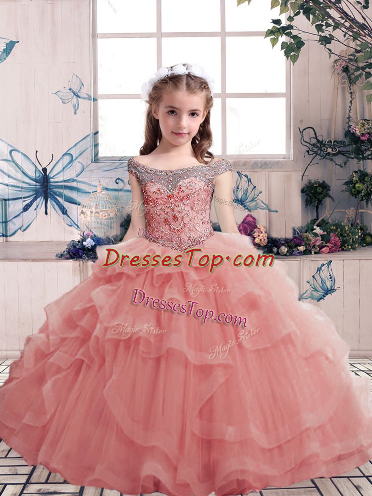 Pink Ball Gowns Scoop Sleeveless Tulle Floor Length Lace Up Beading and Ruffles Kids Pageant Dress