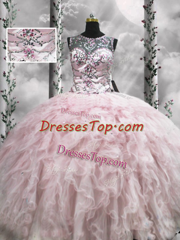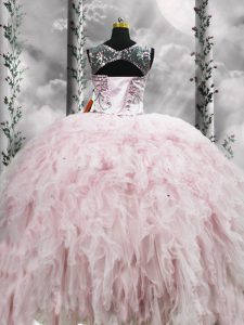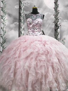 Pink Ball Gowns Scoop Sleeveless Tulle Floor Length Zipper Beading and Ruffles 15 Quinceanera Dress