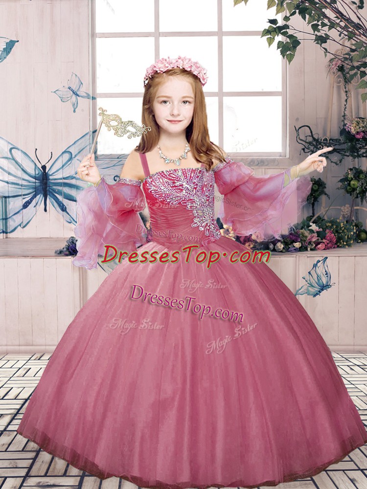 Pink Ball Gowns Straps Sleeveless Tulle Floor Length Lace Up Beading Pageant Gowns For Girls