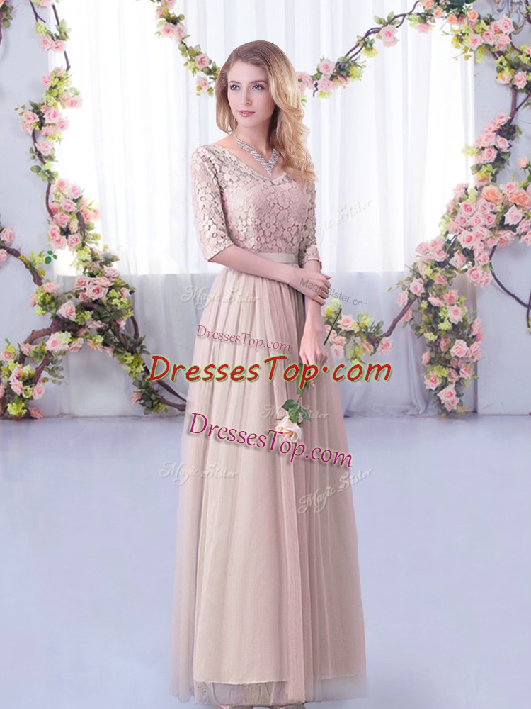 Pink Empire Tulle V-neck Half Sleeves Lace and Belt Floor Length Side Zipper Dama Dress for Quinceanera