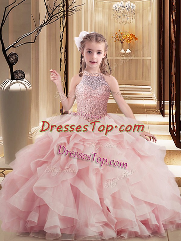 Pink Lace Up Little Girl Pageant Dress Beading and Ruffles Sleeveless Floor Length