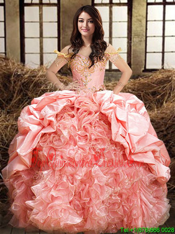 Pink Organza and Taffeta Lace Up Off The Shoulder Sleeveless Floor Length Quinceanera Gown Beading and Ruffles and Pick Ups