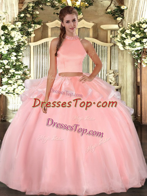 Pink Organza Backless Quinceanera Dresses Sleeveless Floor Length Beading