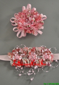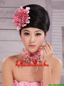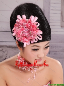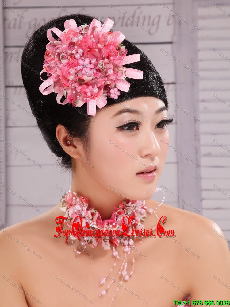 Pink Satin Ribbon and Net Flower With Pearls For Party