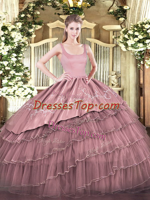 Pink Straps Neckline Embroidery and Ruffled Layers 15 Quinceanera Dress Sleeveless Zipper