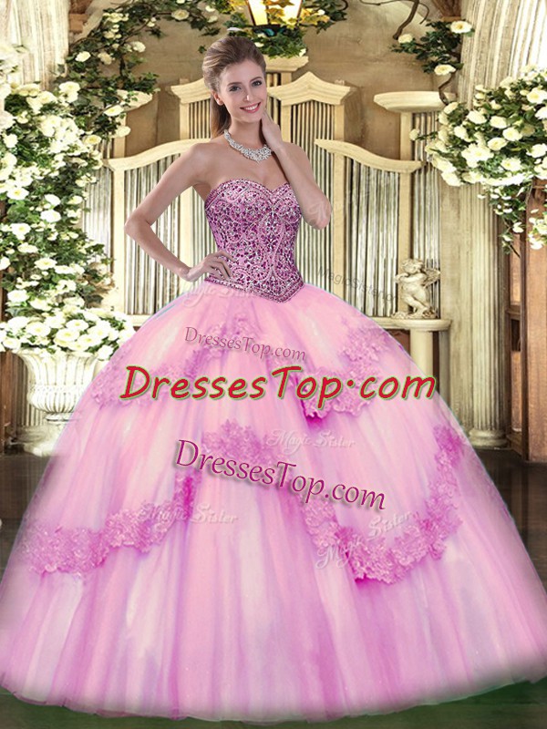 Pink Tulle Lace Up Quinceanera Dresses Sleeveless Floor Length Beading and Appliques and Ruffles