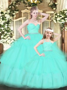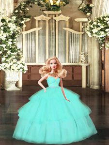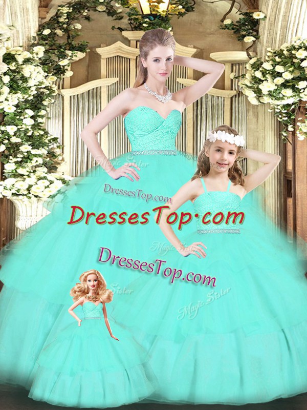 Popular Apple Green Sleeveless Floor Length Lace and Ruffled Layers Zipper Quinceanera Dress