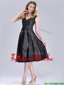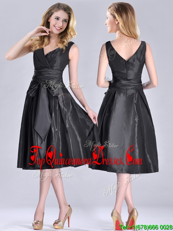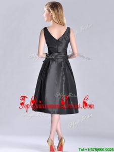 Popular Empire Black Tea Length Dama Dress with Ruching and Bowknot