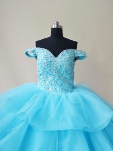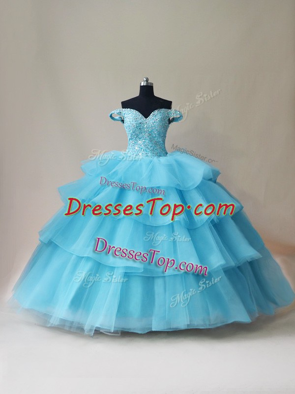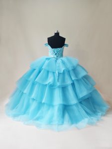 Popular Floor Length Aqua Blue 15 Quinceanera Dress Organza and Tulle Sleeveless Beading and Ruffled Layers