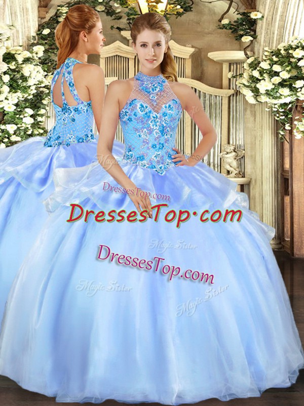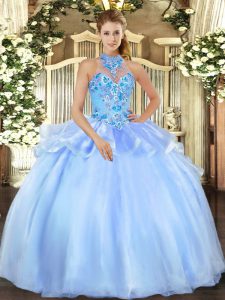 Popular Floor Length Baby Blue Ball Gown Prom Dress Halter Top Sleeveless Lace Up