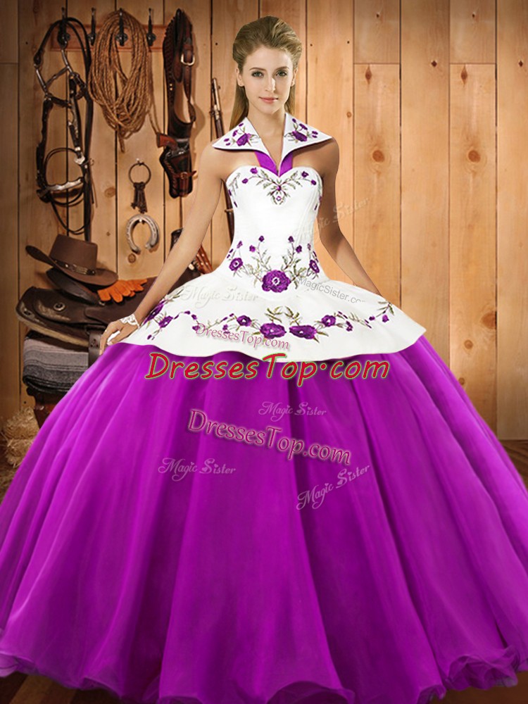 Popular Floor Length Fuchsia 15 Quinceanera Dress Satin and Tulle Sleeveless Embroidery