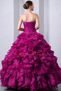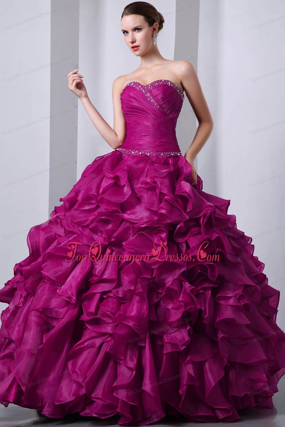 Popular Fuchsia A-Line / Princess Sweetheart Floor-length Organza Beading and Rufffles Quinceanea Dress
