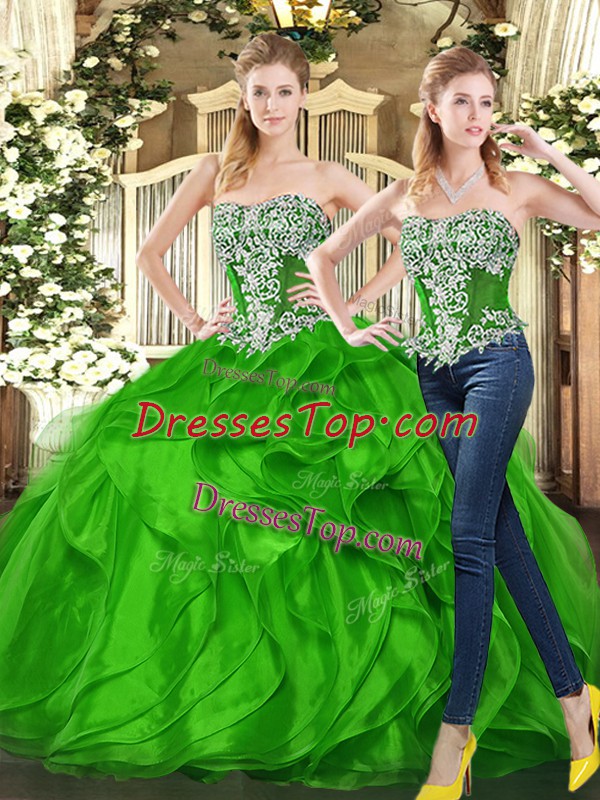 Popular Organza Sweetheart Sleeveless Lace Up Beading and Ruffles 15th Birthday Dress in Green
