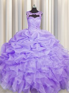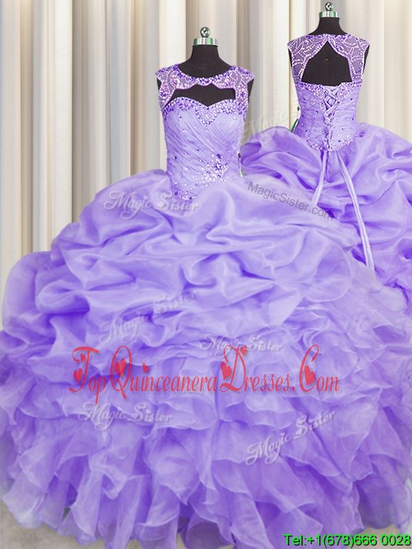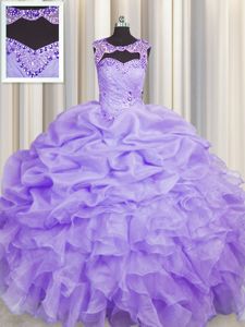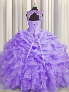 Popular Pick Ups Visible Boning Lavender Sleeveless Organza Lace Up Quinceanera Dresses for Military Ball and Sweet 16 and Quinceanera