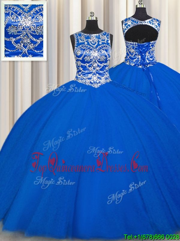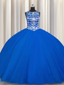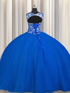 Popular Scoop Sleeveless Sweet 16 Quinceanera Dress Floor Length Beading Royal Blue Tulle