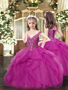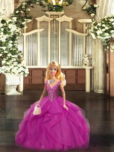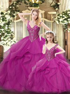 Popular Sleeveless Floor Length Beading and Ruffles Lace Up Quinceanera Gown with Fuchsia