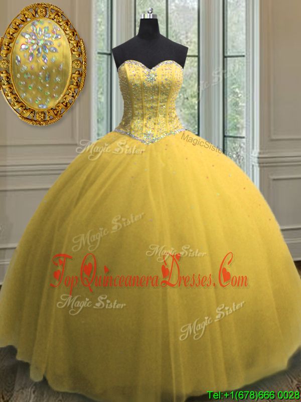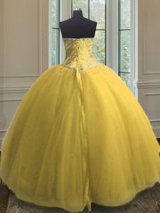 Popular Sleeveless Floor Length Beading and Sequins Lace Up 15 Quinceanera Dress with Gold