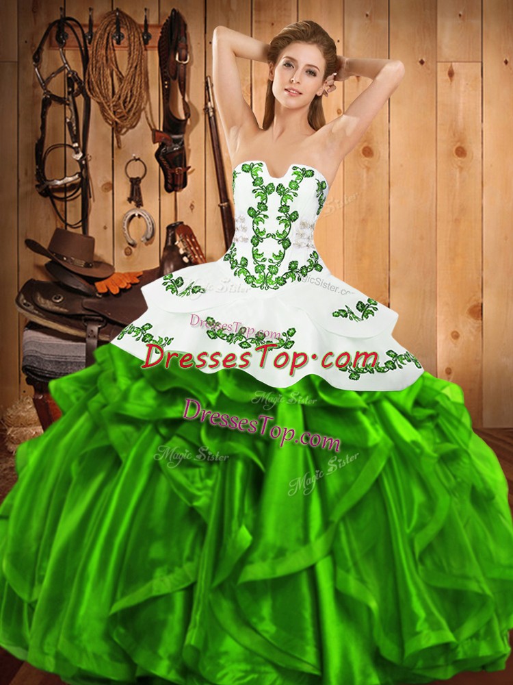 Popular Strapless Neckline Embroidery and Ruffles Quinceanera Dress Sleeveless Lace Up