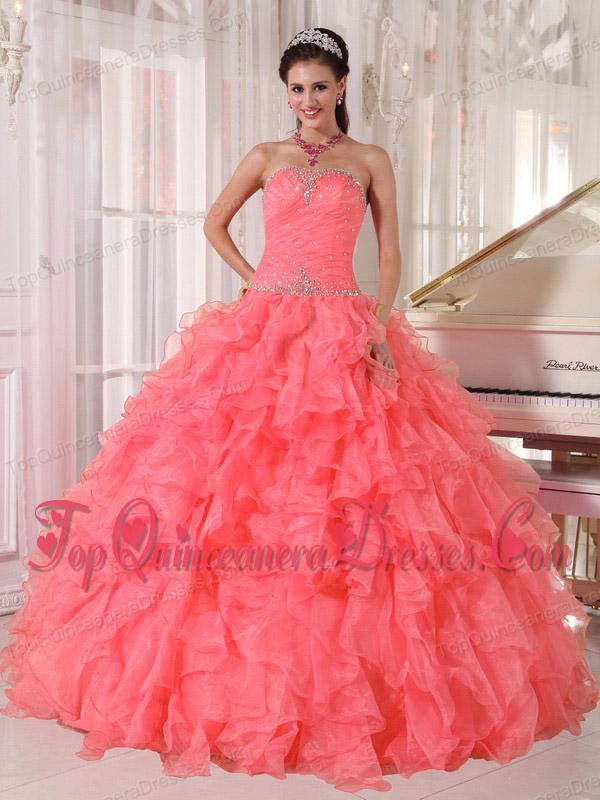 Popular Strapless Watermelon Red Ruffles Beading Classic Quinceanera Dresses for 2014