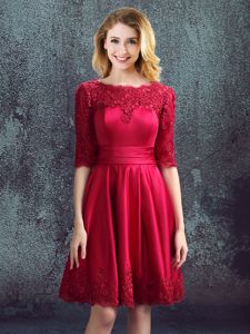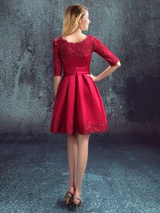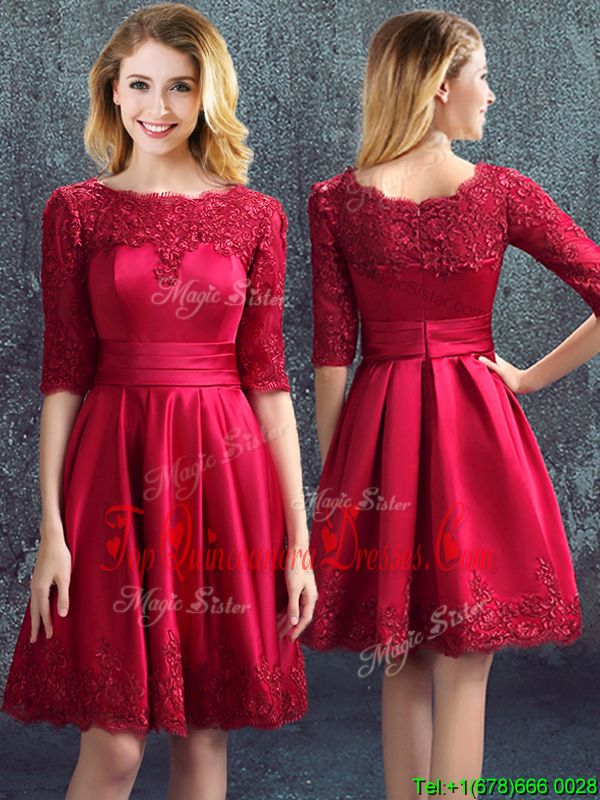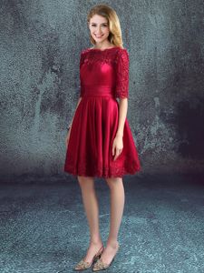 Popular Wine Red Empire Lace Vestidos de Damas Zipper Satin Half Sleeves Mini Length