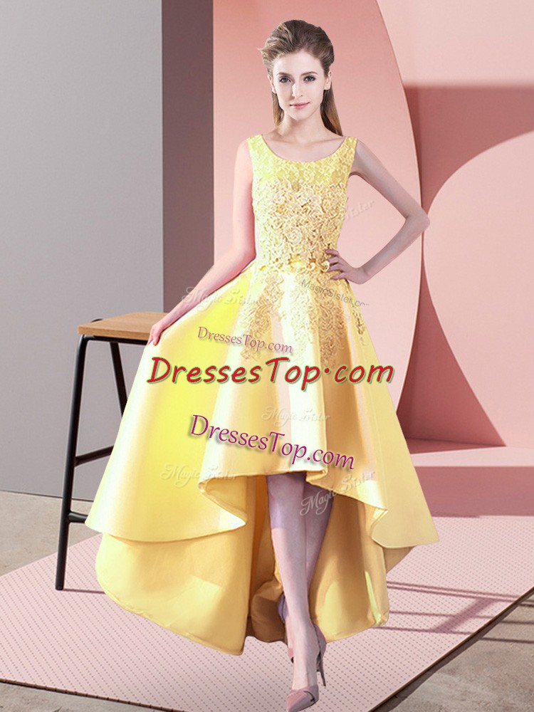 Popular Yellow A-line Satin Scoop Sleeveless Lace High Low Zipper Damas Dress