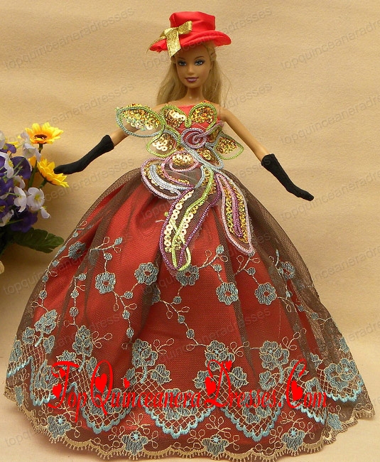 Pretty Appliques Rust Red Strapless Party Clothes Fashion Dress for Noble Barbie