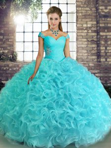 Pretty Aqua Blue Ball Gowns Beading Sweet 16 Dresses Lace Up Fabric With Rolling Flowers Sleeveless Floor Length