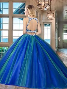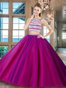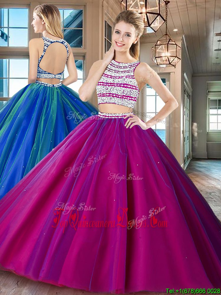 Pretty Backless Scoop Sleeveless Ball Gown Prom Dress Floor Length Beading Fuchsia Tulle