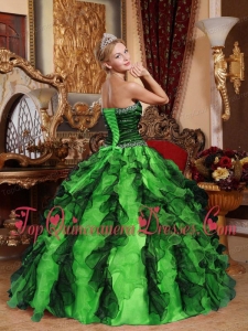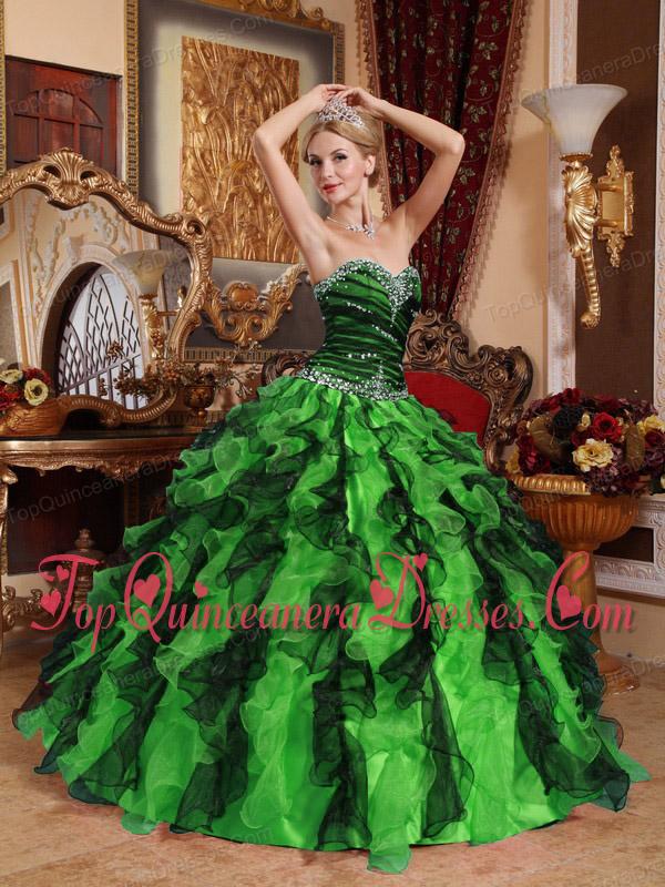 Pretty Ball Gown Green and Black Sweetheart Beading and Ruffles Quinceanera Dress
