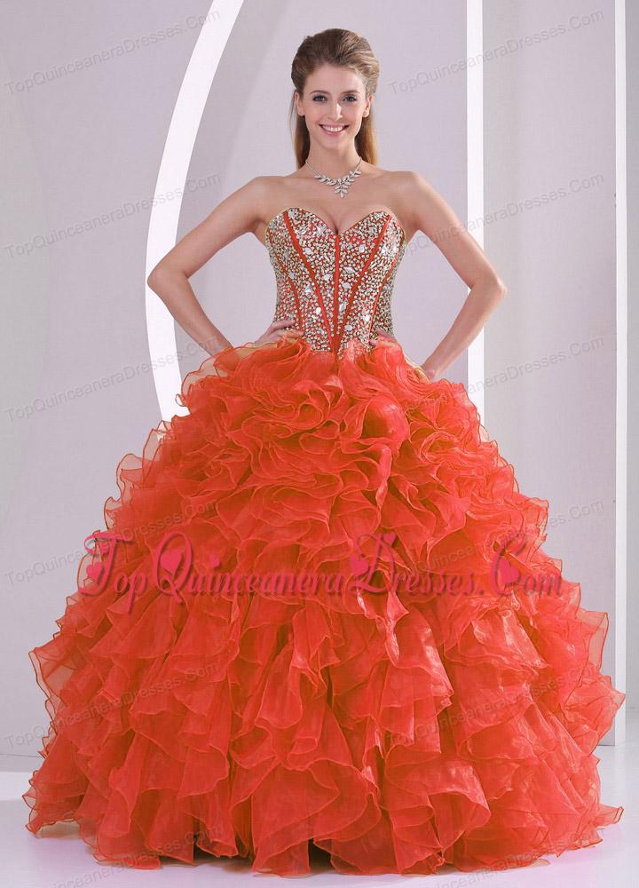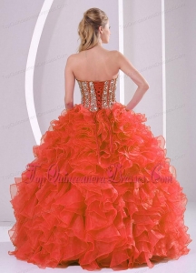Pretty Ball Gown Sweetheart Ruffles and Beaded Decorate Coral Red Quinceanera Gowns
