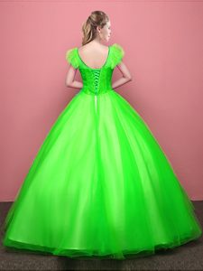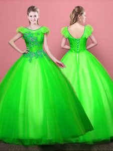 Pretty Ball Gowns Scoop Short Sleeves Tulle Floor Length Lace Up Appliques Quince Ball Gowns