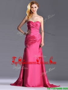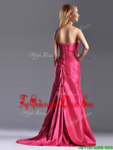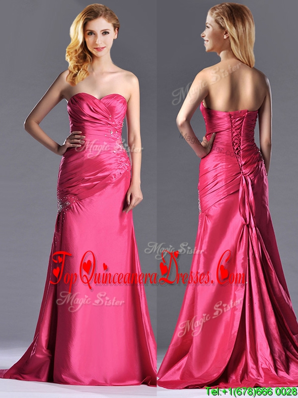 Pretty Beaded and Ruched Coral Red Column Prom Dress with Brush Train