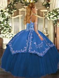 Pretty Blue Ball Gowns Halter Top Sleeveless Tulle Floor Length Lace Up Beading and Embroidery Sweet 16 Dresses