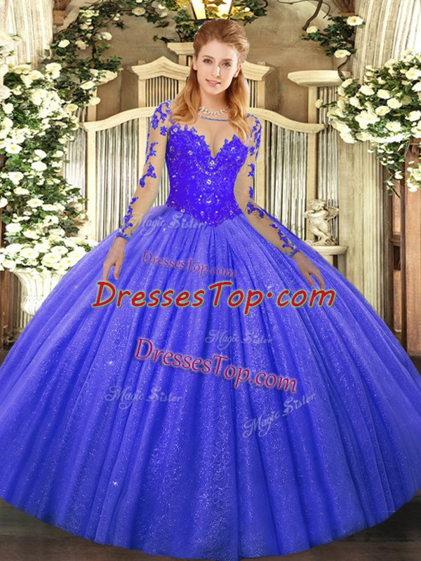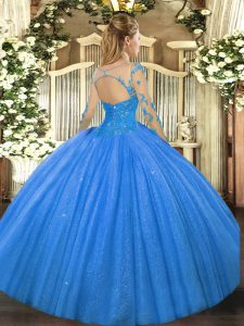 Pretty Blue Ball Gowns Lace Sweet 16 Dress Lace Up Tulle Long Sleeves Floor Length