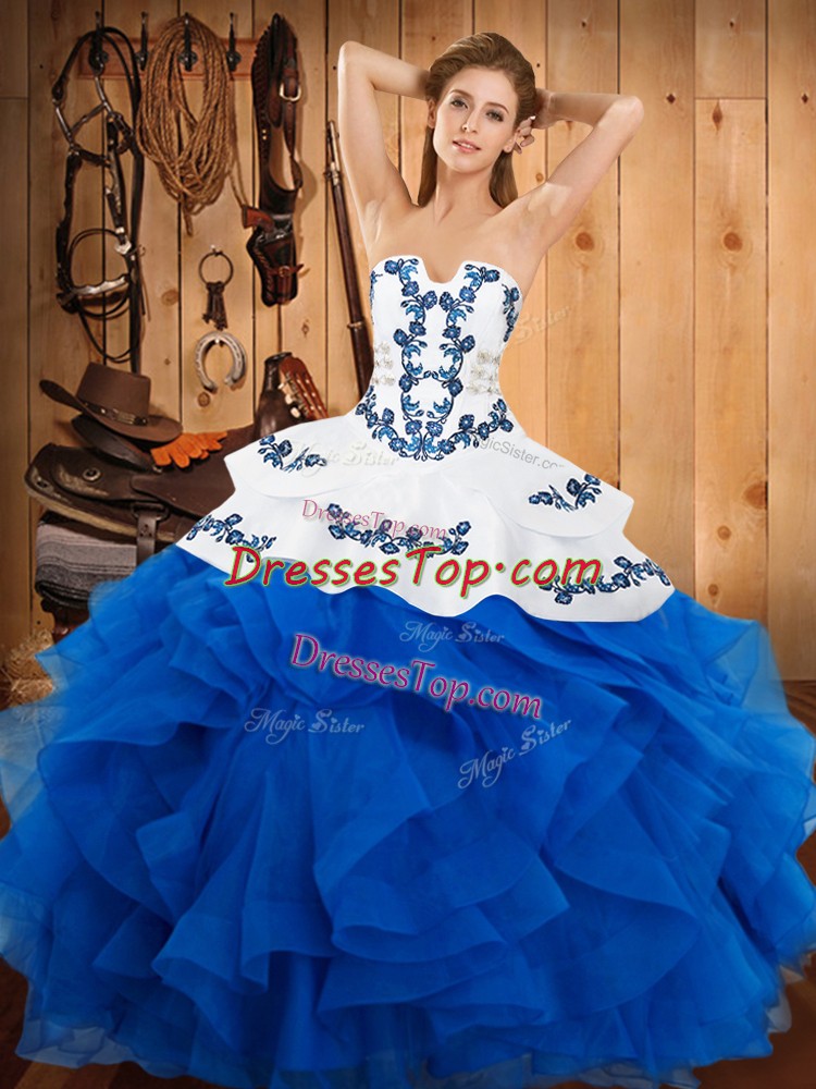 Pretty Blue Strapless Lace Up Embroidery and Ruffles 15 Quinceanera Dress Sleeveless
