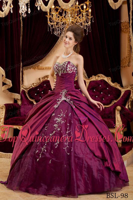 Pretty Burgundy Ball Gown Sweetheart Floor-length Taffeta and Tulle Appliques Quinceanera Dress