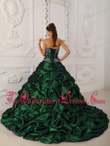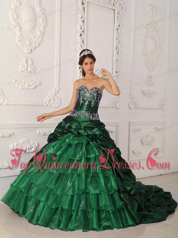 Pretty Dark Green Ball Gown Sweetheart Chapel Train Taffeta and Organza Appliques Quinceanera Dress