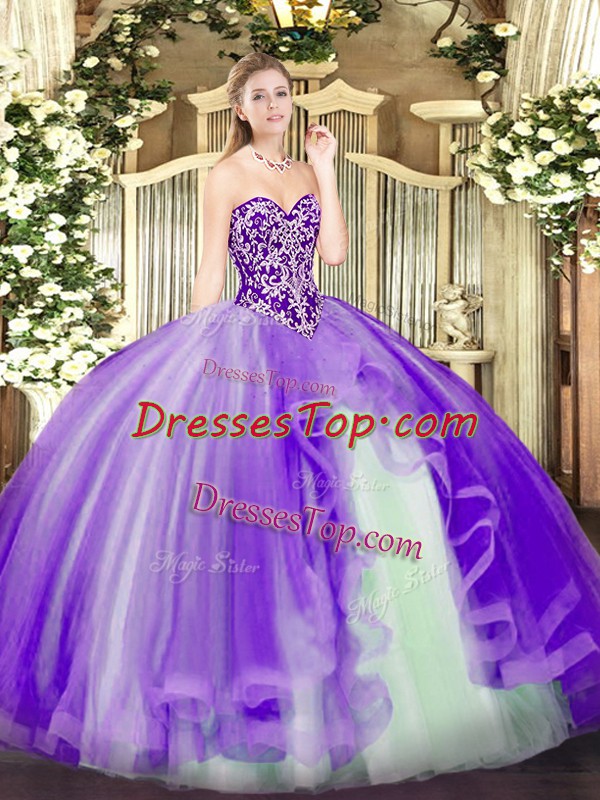 Pretty Floor Length Lavender Sweet 16 Dress Tulle Sleeveless Beading and Ruffles