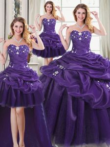 Pretty Four Piece Sleeveless Organza Floor Length Lace Up Quinceanera Dresses in Purple for with Beading and Appliques and Pick Ups